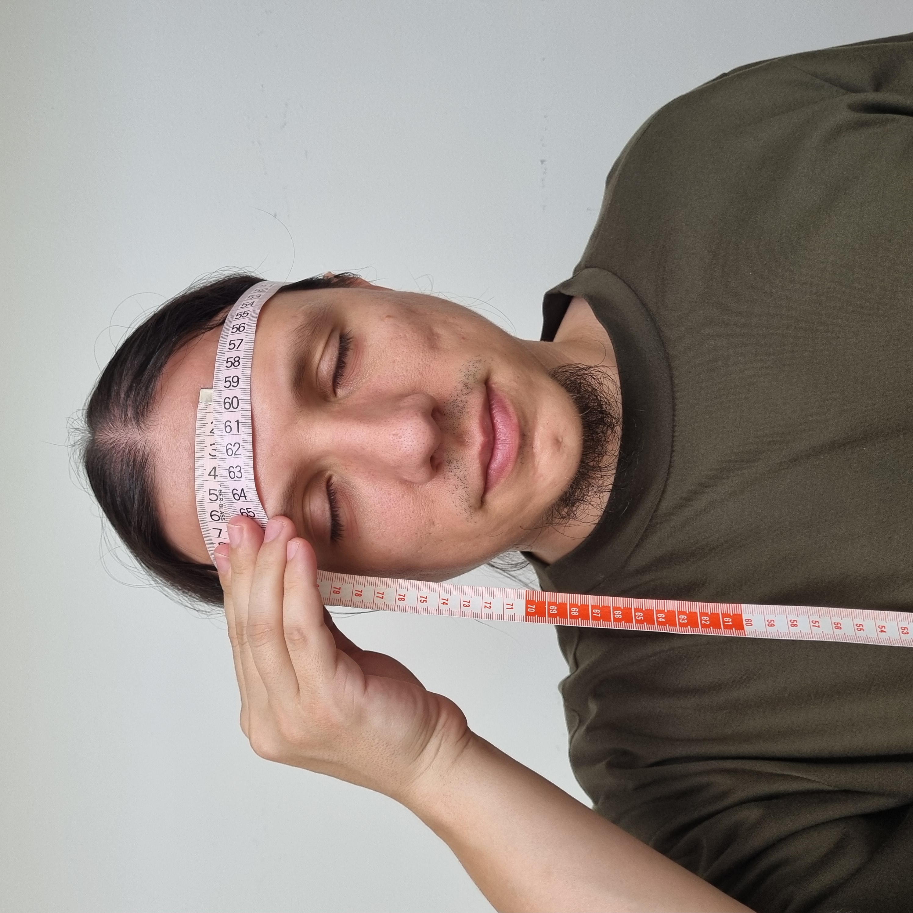 Pegue uma fita métrica e passe em volta da cabeça nesse ângulo e posição:
